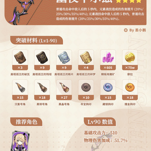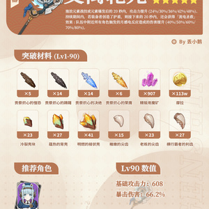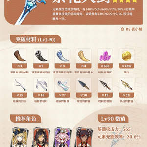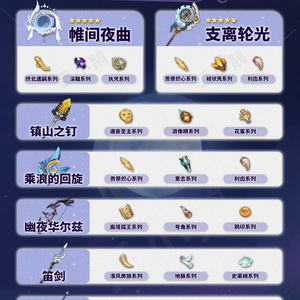 旅行者好,我是丢小鹅~ 为你带来原神「月之四」上半Up武器突破材料~ ● 5星武器:「法器·帷间夜曲」(新)、「长柄武器·支离轮光」 ● 4星武器:「长柄武器·镇山之钉」、「法器·乘浪的回旋」、「弓·幽夜华尔兹」、「单手剑·笛剑」、「双手剑·祭礼大剑」